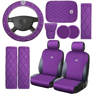 Estune 14PCS Purple Car Accessories Set Leather Car Seat Covers